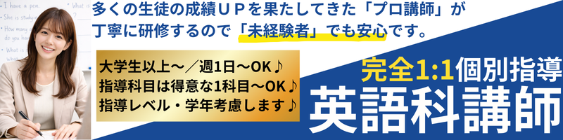 | 応募資格 | 大学生/大学院生/社会人の方は大卒(中退可) ◆英語を指導可能な方 ◆未経験歓迎(研修あり)。生徒の「できた」を一緒に喜べる方、勉強の面白さを伝えることに興味がある方、受験や勉強の経験を活かしたい方、誠実に取り組める方。 ★★★★★★★★★ |